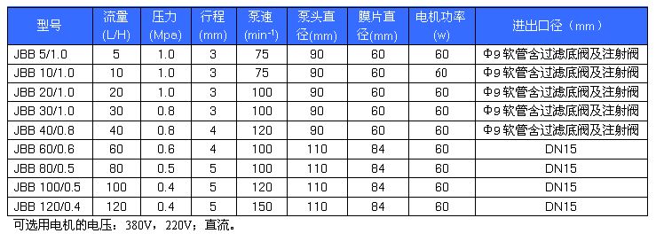 JBB系列机械驱动隔膜式计量泵的性能参数表: